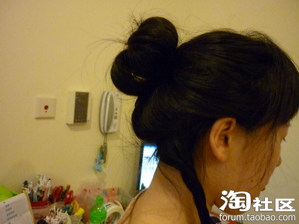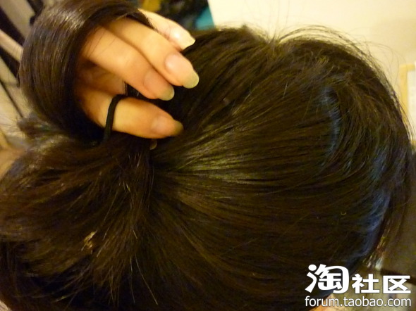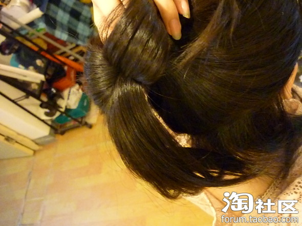 中间很丑吧,不要紧,自己稍微把两边头发往中间弄一下,用小黑夹夹好