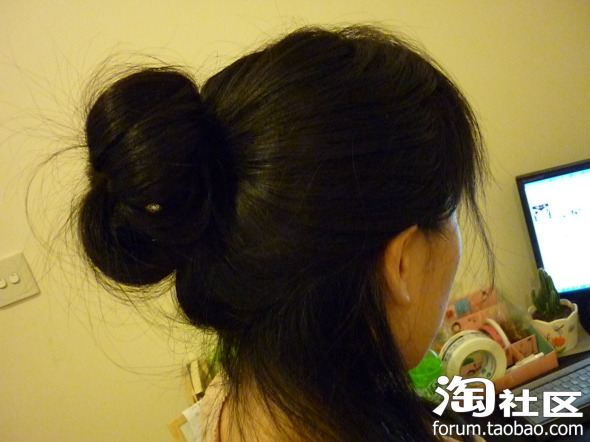 然后再把余下的一份头发同样的方法塞到皮筋里面,看看塞好后的样子,花苞吧,不过还没有完喔