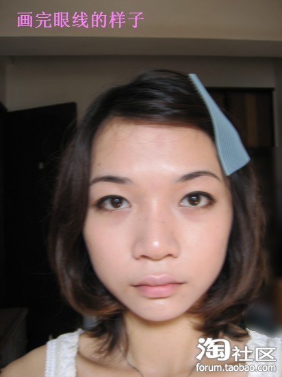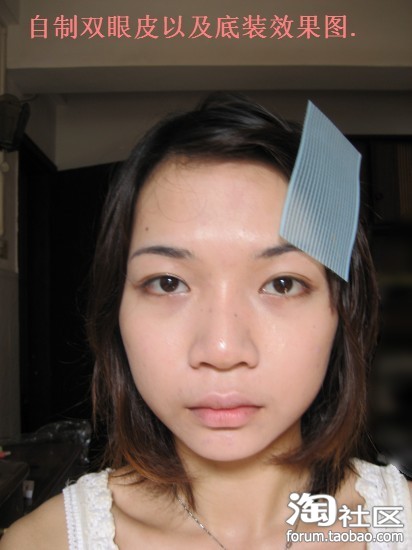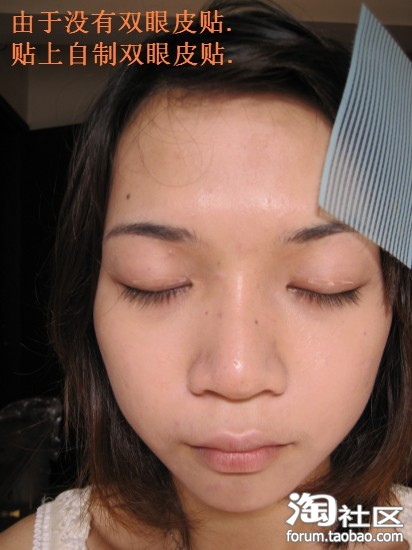 再来眼睛没型,贴上自己用透明胶剪出来的,自制双眼皮贴(我经常这样哦)
