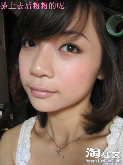 头上只放几个卷卷...上腮红咯,用手指沾着抹开来.