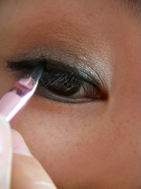 用黑色眼影以三角形的形式晕染下眼睑到瞳孔正下方。