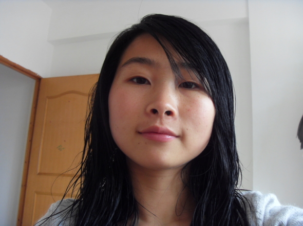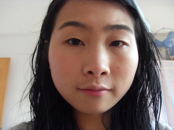 琼琼习惯先把BB霜挤到手心上,然后两手搓热,往脸上以按压式的方法摸匀,摸开了就成这样啦。