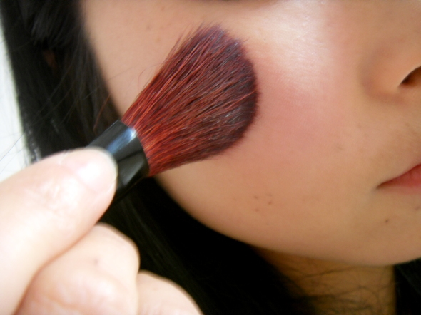 用腮红刷蘸取腮红以斜上的方向扫到太阳穴的位置。