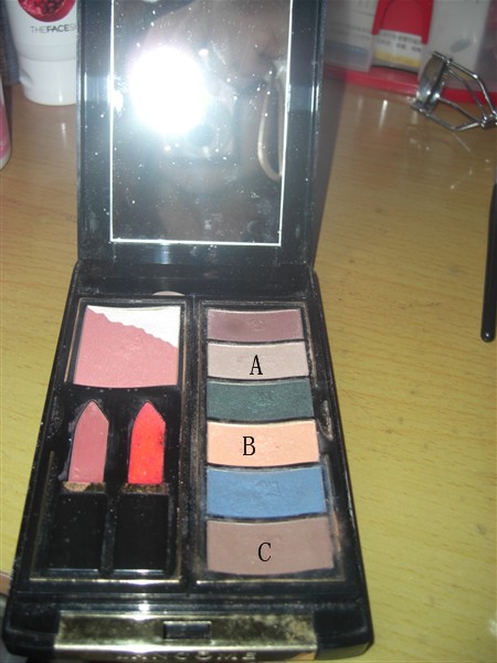上眼影,年代有点久的兰蔻眼影组合,我实在是擦不干净,将就吧,用的色已经标好了