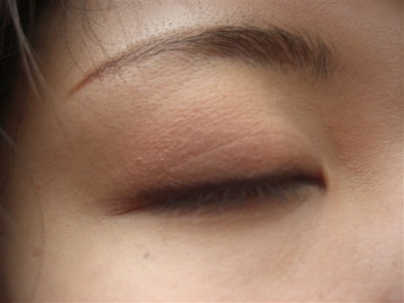 腮红用的是SKIN FOOD的橘色腮红膏,带亮光,不能打多了,显黑,不过好瘦脸。。。侧影用的是美国娘家的四色高光侧影组合。上的方法是从你的瞳孔外侧垂下一条线,再从鼻下平行一条线,那么在你的脸侧部就会有两个区,那么上区就是腮红区,下区就是侧影区。切忌不可上的太多,颜色要过渡自然,要不会显的面部很脏。