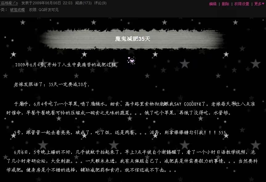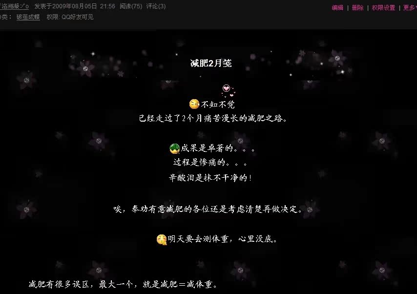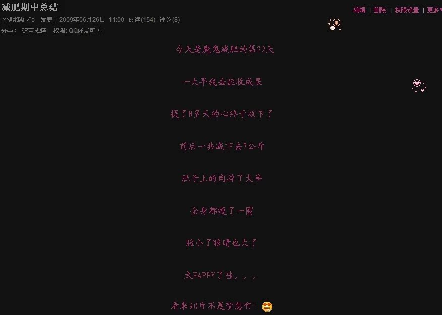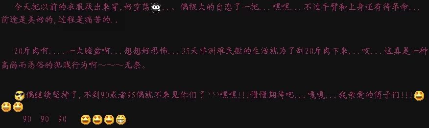 下 面,把我接近一年时间,从138到94的艰难减肥历程的空间日志转贴出来,希望给一些正尝试减肥的亲们些须安慰和信心,减肥是一个过程而不是一个结果,减肥前后最需要调整的心态而不是体态,切记!