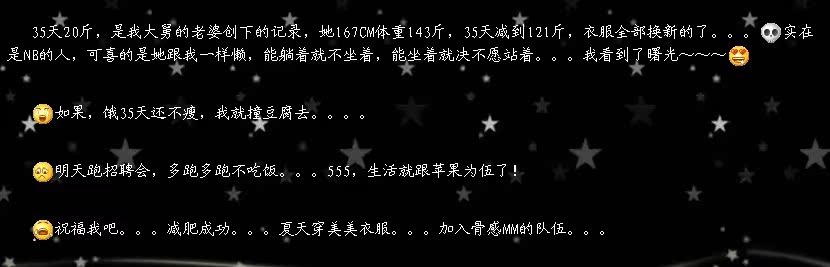 先总结这么多,呵呵,还有谁开始打算节食减肥的可以参照下,我身边很多人也开始减肥了,就是能坚持的真没几个,不过,有时候想想,减肥是个很考研毅力的事情,把这个当作磨练也是一件好事吧,希望各位减肥都能成功