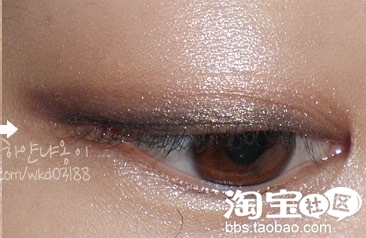 上眼皮根部从后向前画深褐色眼影 (眼线的部位)提亮眼神晕染开