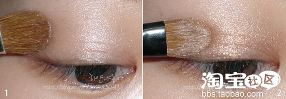 眼妆先选最浅的打底 然后用金色系的刷上眼皮三分之一多点(双眼皮上面一点)