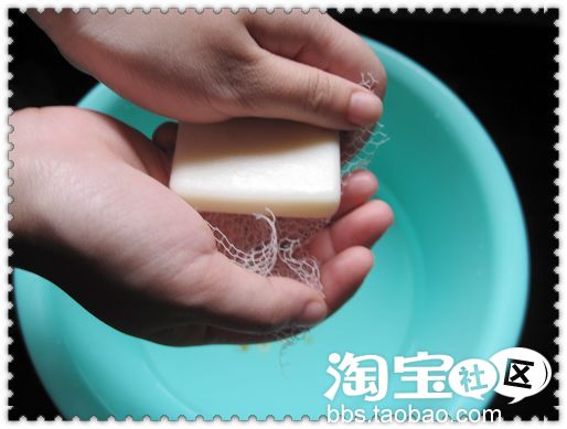 双手把温水浇在脸上,让脸部湿润,再将皂沾水后用起泡网搓出泡沫来。