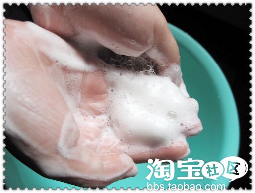 把搓出的大量泡沫涂在脸上轻揉1分钟,打圈的手法是从下至上打圈,要对抗地球引力嘛,呵呵~,在鼻翼周围重点清洗一下,最后双手捧起大量温水浇往脸上冲洗干净。