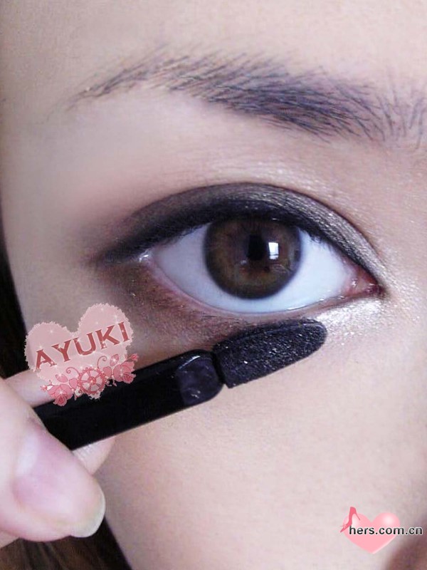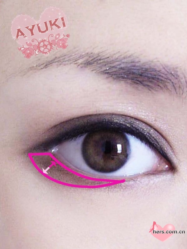 靠近下眼睑内侧的线条和上眼线的地方是最深的,慢慢向下想旁边晕开.