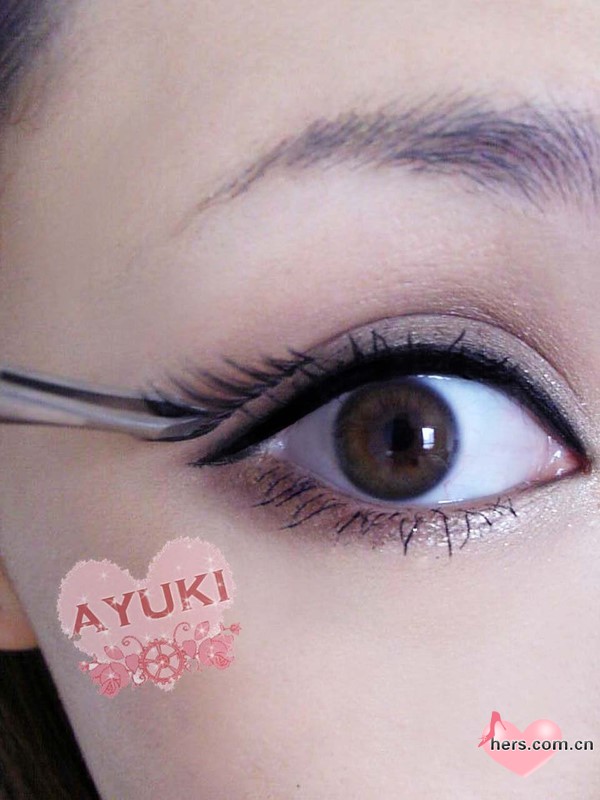 假睫毛,在眼尾粘上.注意,稍微的往后粘点,要长出自己的眼睛