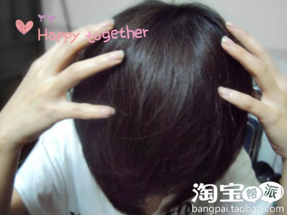 先稍微低下头,从后面开始,张开五指,以左右扫动的动作,轻轻扫在头发上,特别是后脑和两侧的位置