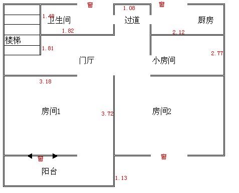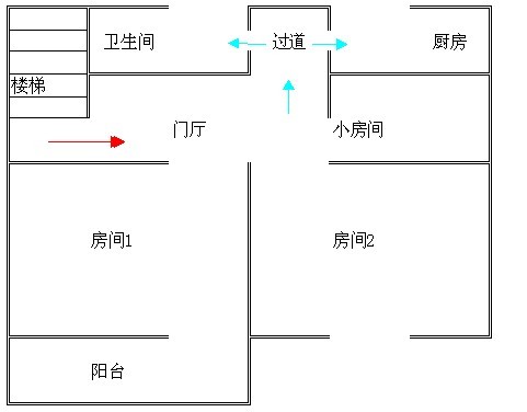 因是较早的房子,所以我们想尽量不去动墙。门厅还是暗的,只有卫生间和厨房的那个过道透过点光,我是想把现在的门厅改为餐厅。把房间1做为客厅。然后把阳台的门打到中间.把阳台包起来。注:原户主没包铝合金
