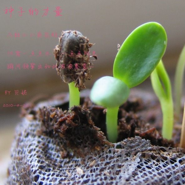前几天种了几颗葵花籽,发芽了,春意浓浓,赏心悦目,目前是偶电脑前的绿色小景~