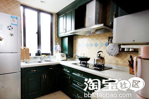 唯一的一张厨房照片,邮政绿的实木橱柜