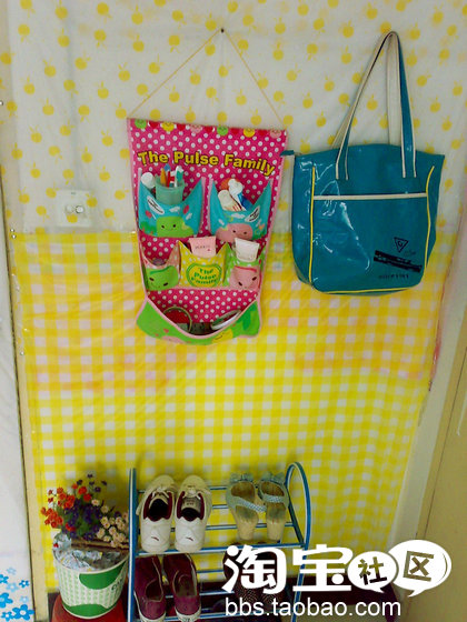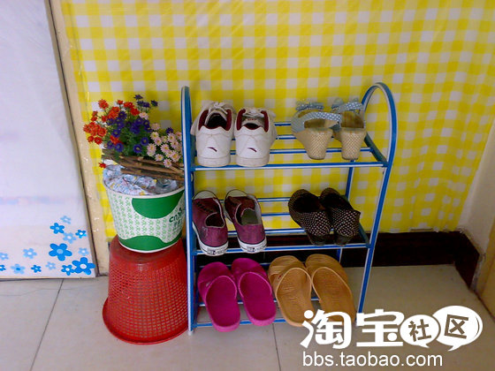 这是我放鞋的地方,其他的鞋都存放在鞋盒里,然后放在床低下,很能省地方的,呵呵。这个垃圾篓是我朋友不租房子留下来给我的,我觉得没什么用就给它倒着放,然后放上我的仿真花,呵呵,还是为了省空间