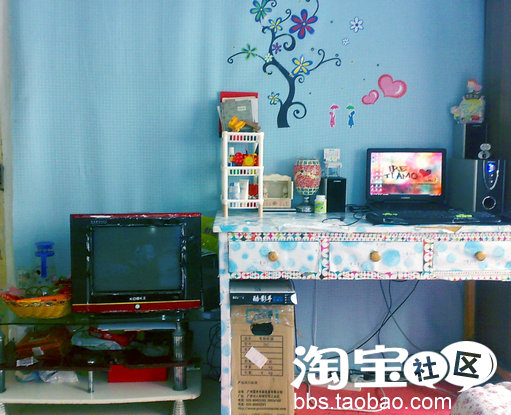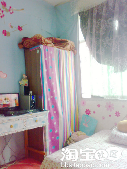 好了 这就是我房间的大概效果,呵呵 ,窗帘一共花了80块钱,床单被罩一共是109.墙布一共是100.贴纸是10,沙发是120《买的二手的》,收纳架是8块钱,地垫是12. 那些小物品都是朋友送的,所以无法计价,呵呵,好了,如果喜欢我的房间,就多多支持哦,谢谢大家