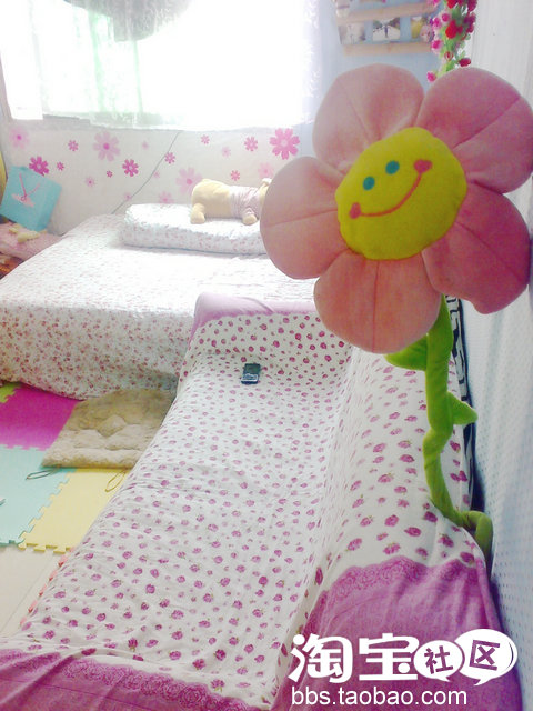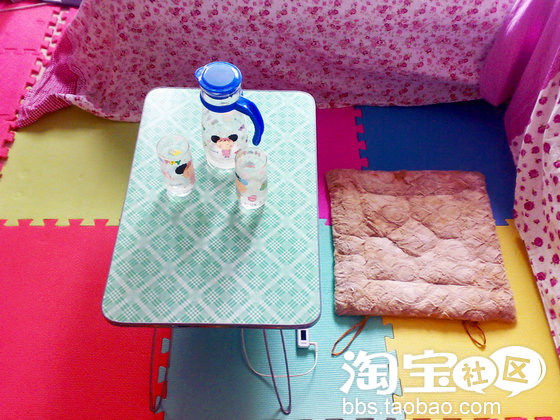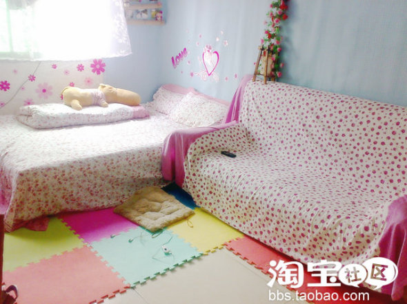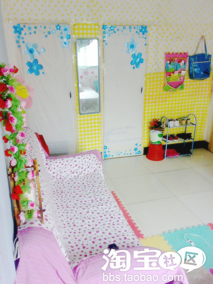 感觉地面是白色的不是很好看,而且很容易脏,所以就买了这些地垫铺在地面上,感觉很不错。墙体是淡蓝色的,因为是租来的房子,所以不能随便在墙面上上涂料,所以就买了布料,钉在墙上、感觉和涂料是一样的