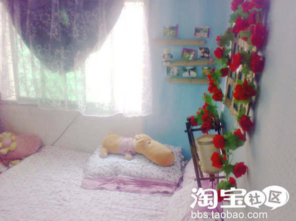 墙上这些东西都是自己亲手做的,都是一些废品,然后自己裁剪,再加上这些花,感觉很不错。相册墙也是一些废品做的,感觉还行。窗帘的用处蛮大的,因为我的房子是朝阳的,所以夏天会有大大的太阳折射进来,所以就买了网吧用的窗帘,遮阳布做里面的打底,然后在买窗纱做修饰,这样就不会很单调,很难看了。而且房间真的凉快了不少。