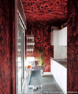 色彩浓重、图案繁复的墙纸很少会被大面积使用,而设计师大胆地将它运用于这个狭小的厨房空间,带有一种强烈的视觉冲击,极好地逆转了灰调空间的冷漠。