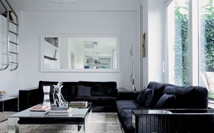 客厅是简洁的黑白对比,暖灰色的地毯与丝绒的沙发面料带来温暖的触感,镜面质感的家具具有强烈的设计感。