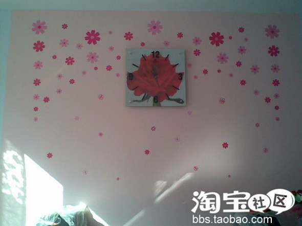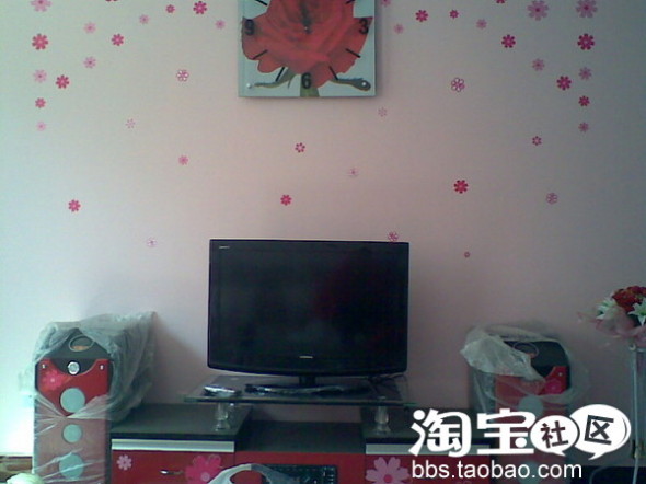 影视墙我也采用了和横梁相呼应的粉色,另外就是墙贴的功劳了,哦还有我的花之表60元