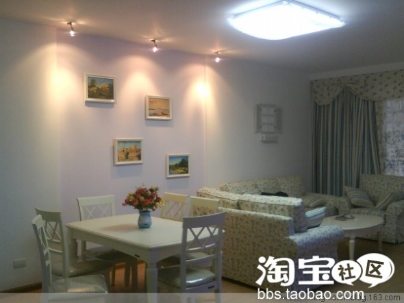 我家的客厅+餐厅,我家除了错层到卧室的走廊有点吊顶,其余地方都没弄。看到那四幅画了吧!学生作品,还可以吧~ 全友的家具,包括沙发,本来想网购,不过老公坚决反对,没实现!不过沙发后面的小窗和主灯被我偷偷地买了,呵呵,,,现在放了很多漂亮的东西,效果很好!