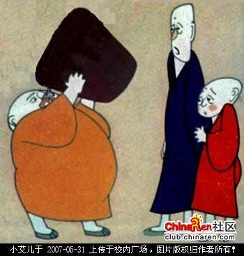 三个和尚——嘿嘿,一个和尚挑水吃,两个和尚担水吃,三个和尚就米水吃咯!