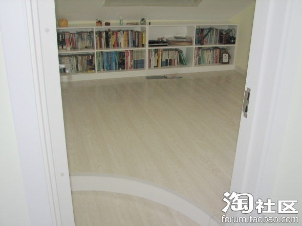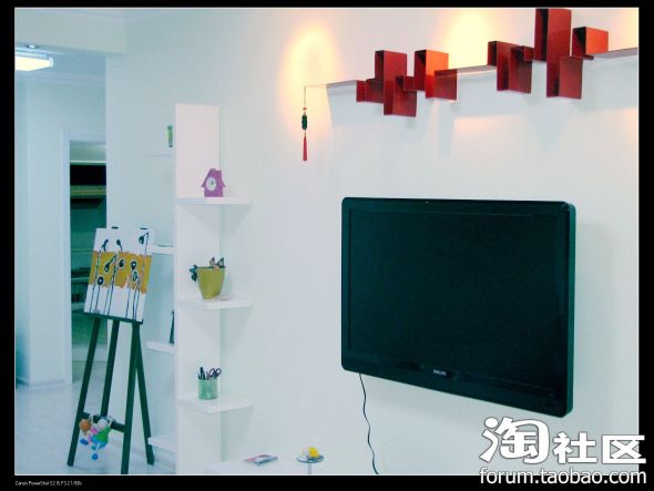 1、这是客厅的全景图,本来墙面是淡绿色的,由于屋内光线太强,照片里不仔细看就成白色了,呵呵,图片主体是电视墙,左边照了一半的是餐厅和厨房,绿色木条的是我的画架,上面那幅《小荷》是我自己画的(我家挂的所有画都是我自己画的油画哦,呵呵,小小显摆一下),画架旁边是我们自己设计找木匠师傅打的实木书架,电视是46寸的,上边那个很别致的红色造型书架是我从淘宝社区的论坛里搜来的样子,然后画了图纸,找铁匠铺DIY的,右边是另一个书架,当然也是DIY,呵呵,那个开着的门是次卧,是一间很小,有斜顶和天窗的小屋子。夏天可以趟在里面看星星。电视墙后面是主卧,一会儿给大家看特写。这就是我家基本布局。下面分镜头介绍(咳咳,喝口水先):