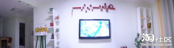 14、现在该说说电视墙了,电视墙没特别的装饰,主要是用两边两给不同造型的书架归出空间,值得一说的,电视是上面那个红色的铁艺造型书架。