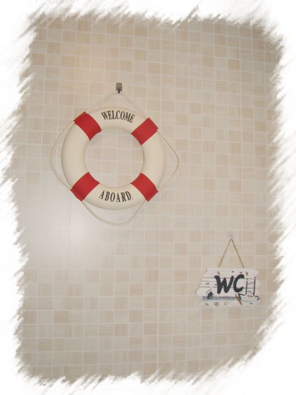 42、正对着门的马桶上方,卫生间墙上挂的救生圈