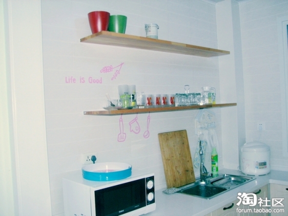 24、厨房的另一面,嫌太沉闷,没有做橱柜,打了搁板,上面那层的两个花盆是环保材料制成的http://item.taobao.com/item_detail.jhtml?item_id=d5019de4d24823c78507d8f5c3b48249&x_id=db2我没时间养花,就放在搁架上做了杂物桶也很好用的。右边那个也是海上小铁匠的铁皮茶叶罐http://item.taobao.com/auction/item_detail-0db2-00b7424c243f22d8666bcffeabbbe809.htm很有小木屋里老奶奶的味道
