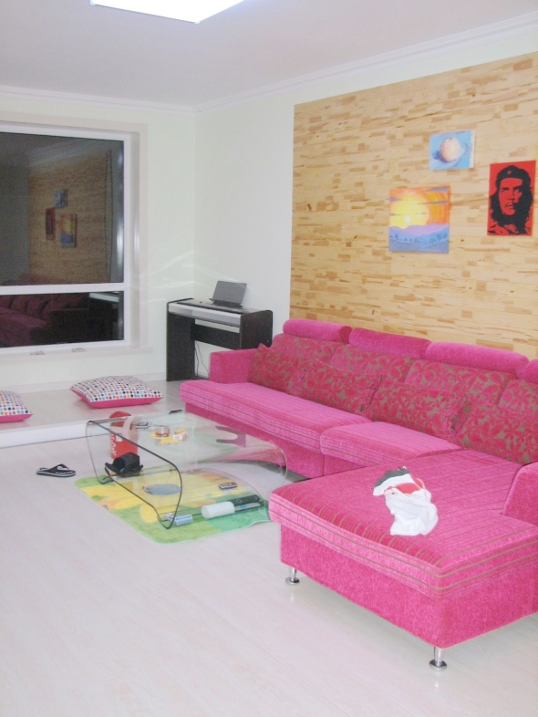 2、沙发背景墙和地台一角,我家是半落地窗,我就在窗边打了个不高的地台(不好意思,忽略我的人字拖)可以在那里喝茶会友,右边是我的电钢琴,背景墙是全实木板材破拆后打磨重装的,上面挂一些我的涂鸦,沙发老公选的,粉色沙发绿色墙,很有对撞效果。