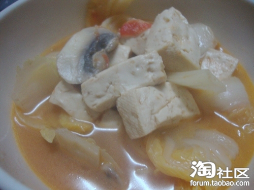 材料:小白菜、豆腐、蘑菇、番茄、盐、鸡精