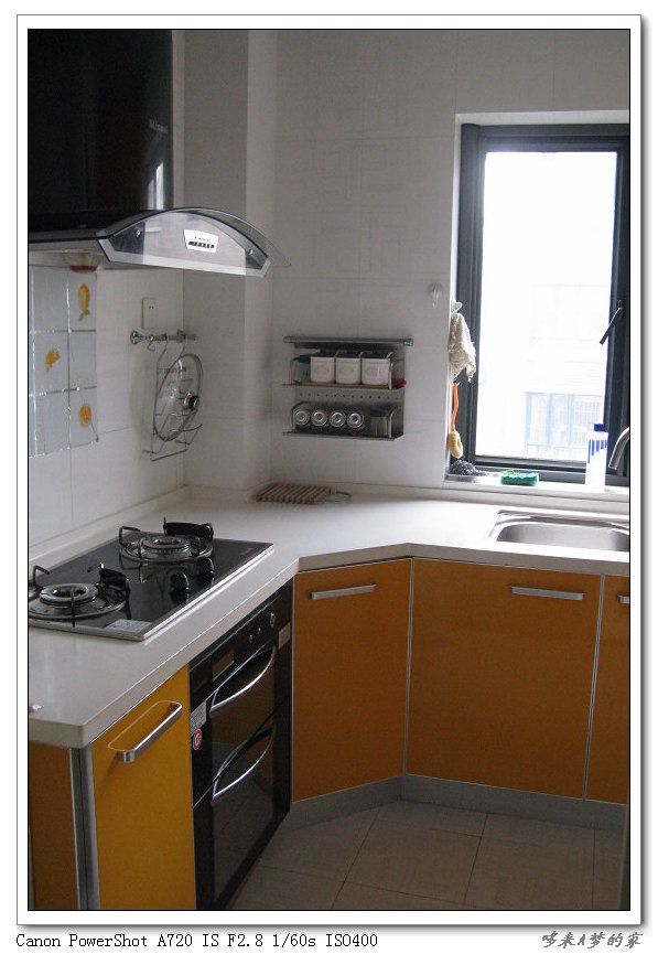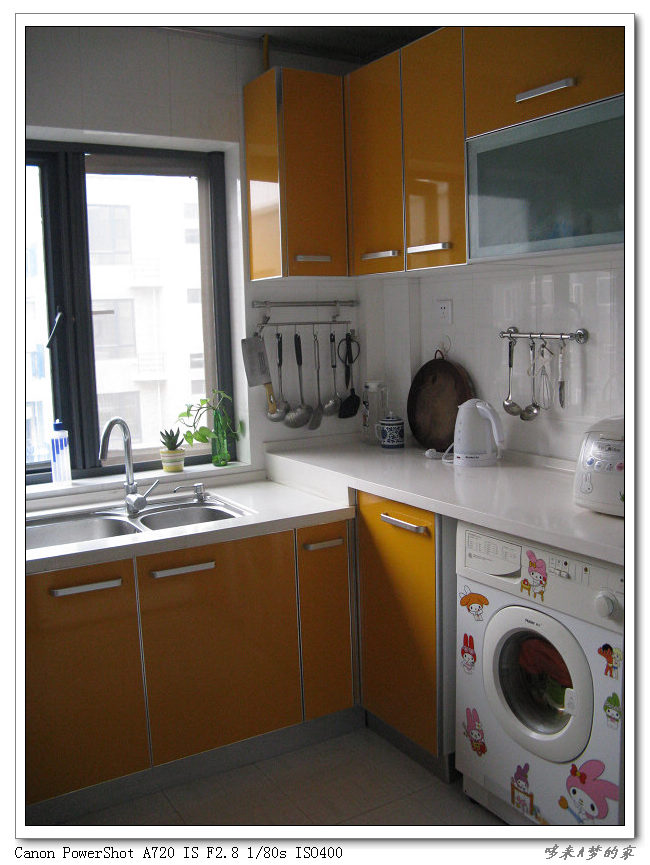 进来看看厨房:林内的灶具,烟机,热水器,康宝的消毒柜,洗衣机是结婚时买的,没钱换新的,所以贴了好多花贴纸遮旧[最后更新时间为 2009-06-01 22:11]