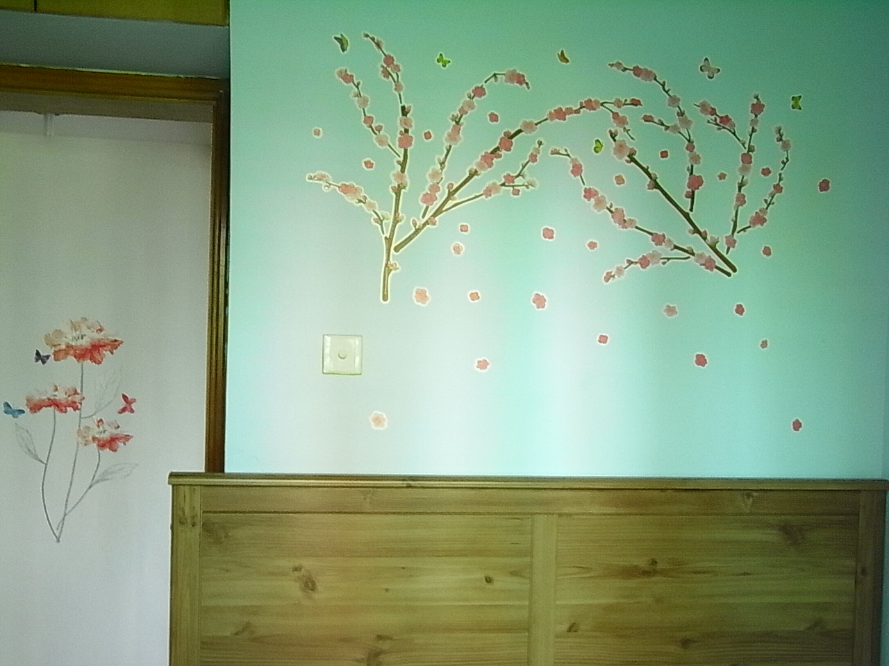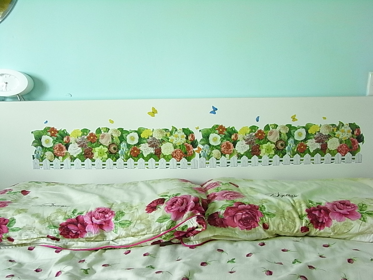这张感觉最田园吧。床头原来是白色的,贴上贴花之后感觉完全不一样了,朋友还问我们是不是换了新床,呵呵。
