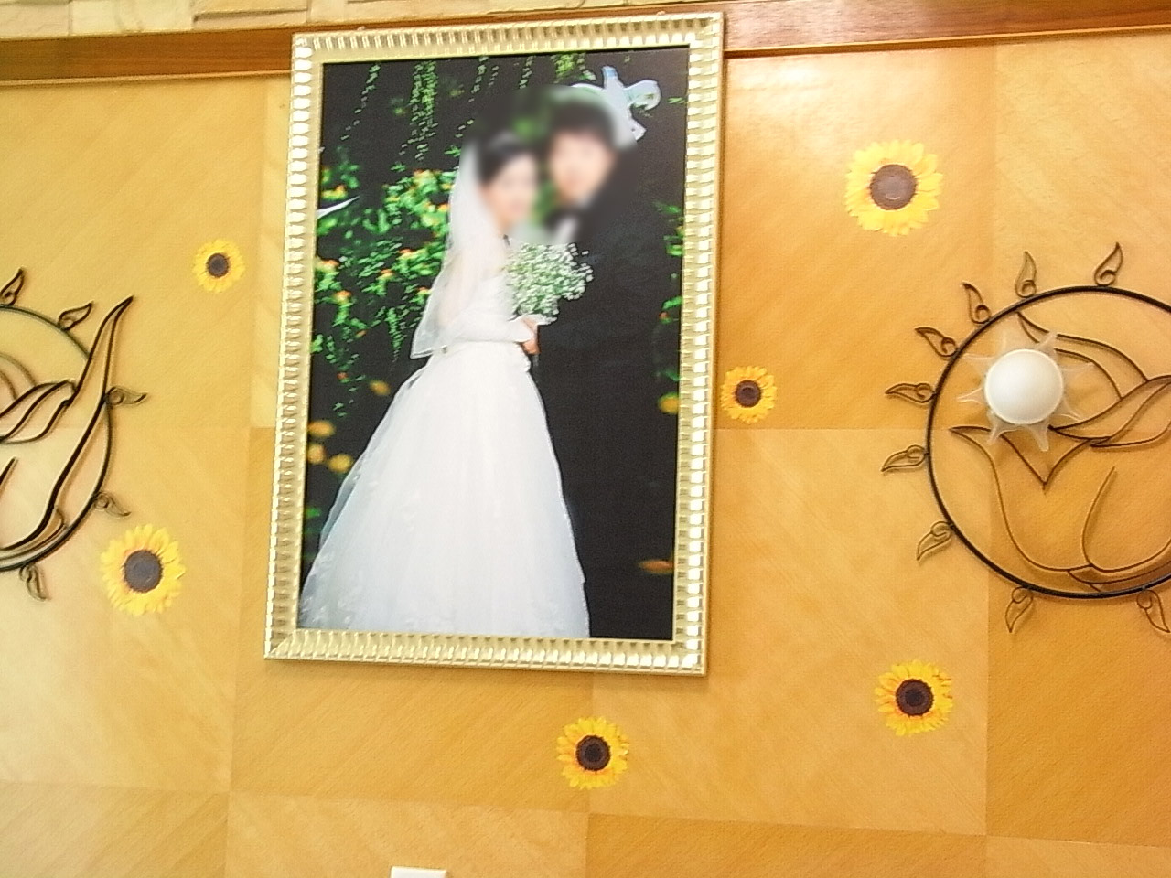 这个贴在客厅背景墙上,跟门口的相呼应,放在婚纱照旁边,不会很单调。我把我和老公的脸模糊了,保留一点隐私,呵呵。