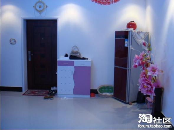 下面的这个是客厅的南墙,冰箱是美的牌2800元,上面的红苹果130元,是结婚时妈妈送我的,象征平平安安。鞋柜是我和老公选的,260元,便宜吧。钟表是老公买的80元。冰箱旁边的装饰牡丹花是爷爷在我结婚的时候送我的,从哈尔滨特意买回来的呢,300元。