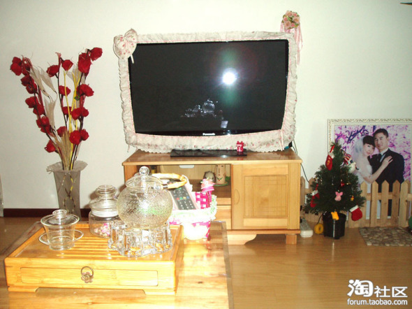 大家请注意,电视一角的那个财神是福建漳州的布袋木偶哦,虽然费了些周折,但卖家人很好,终于让财神木偶落户俺家咧。