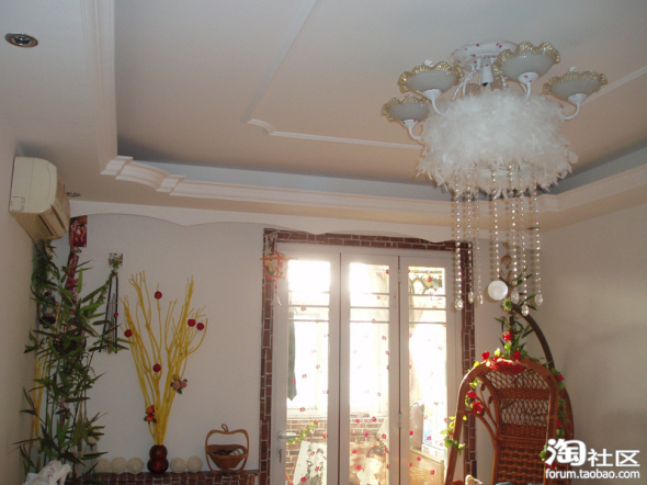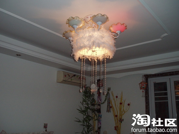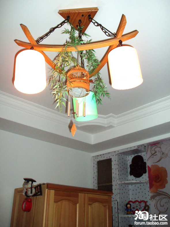 再来看看我得意又一件作品,就是客厅的主灯,这个灯是我用原来7年前的旧灯加上灯罩、壁纸、八角珠等配件自己动手改造的,灯罩的卖家人真的特好,还特别送了一条挂灯的链子。