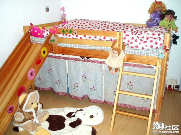 来张滑梯床的正面,床上穿紫衣服的娃娃俺家胖丫叫它汤妞妞,是美美的二妹,那个大毛毛虫是枕头,