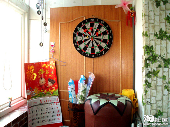 阳台上挂着一个风铃,是八卦镜风铃,据说可以辟邪啦,对面还贴着一对夜光门神,可惜没拍上