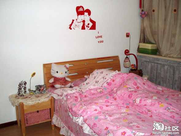 主卧房的大床铺满了KITTY,床头的墙贴是我们的婚照,我在身高贴那个卖家那里按照婚照设计订做的。