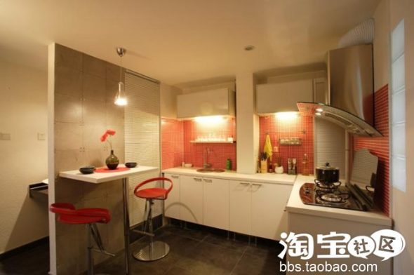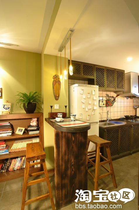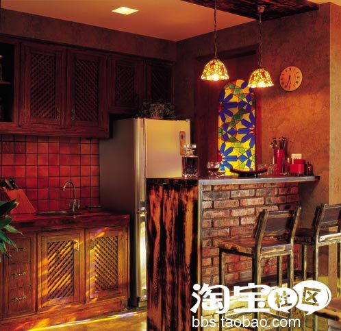 4、 灵性的空间,愉悦的色彩,别致的摆设,小点缀都是丰富居家生活不可或却的角色,木门,复古的水槽,却巧妙的将传统与现代一同诠释,粗犷红砖堆砌的吧台,色彩斑斓的玻璃灯罩,将新与旧,游走在时尚与前卫之间。