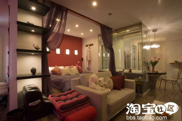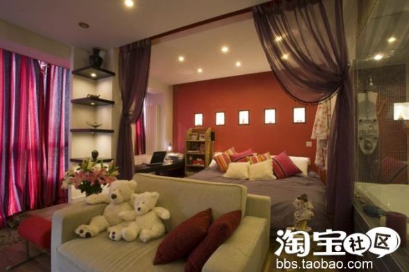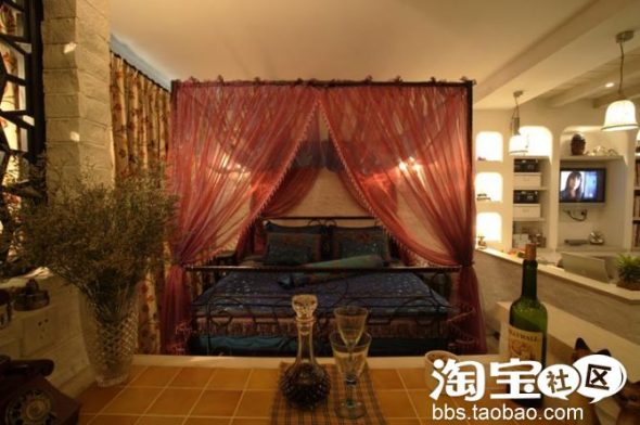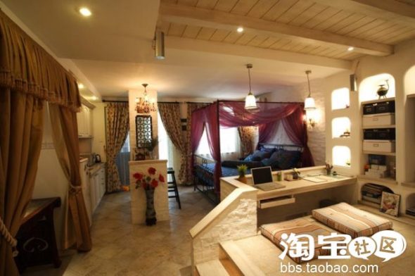 5、床头与储物柜:一个人住就没必要做那么多隔断了吧,卧床和地台之间的纱帘就足以区分空间了;