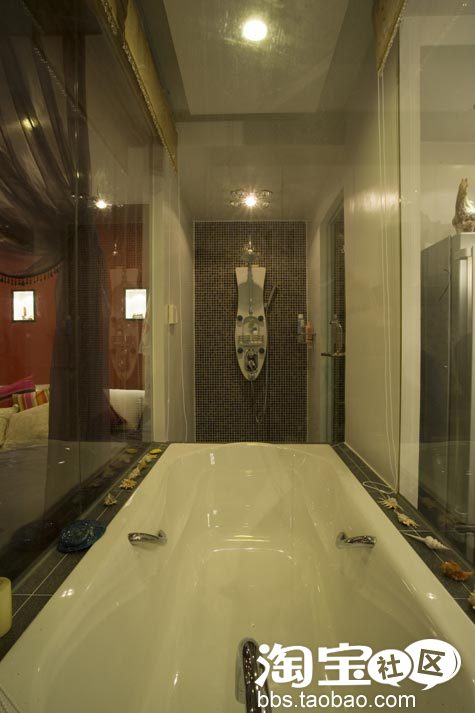 二人世界里不用考虑遮挡,为什么没有选择开放式浴室呢?小两口在这一点上倒是意见一致:好看是好看了,前卫够前卫,就是不够方便卫生,尤其是对于家里有个泡澡狂人来说更不现实。所以牺牲小空间采用玻璃围挡,浴缸处半透明的罗马帘可收可放,更多为了增添情趣,而非私密考虑。(图5、6、7)