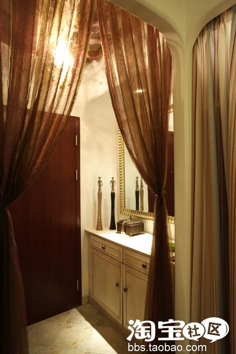 1、 推开那扇厚重的从千心万苦淘回来的木门,仿佛走近了另一个神秘的世界,进门处偌大的落地更衣镜,利用镜面效果拓展视觉空间,也方便在出门前审视自己的衣装,房间中没有用任何硬性的隔断,仅采用了飘逸、曼妙的纱帘便轻松营造出两处别致。