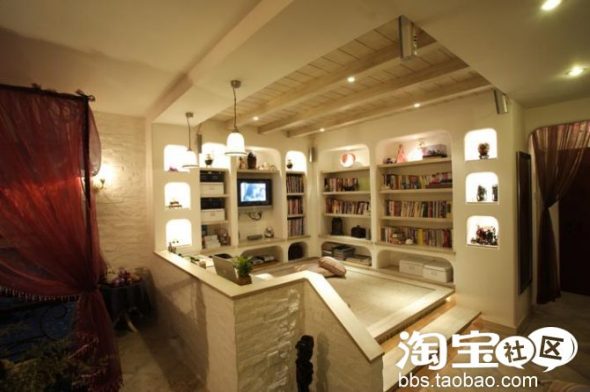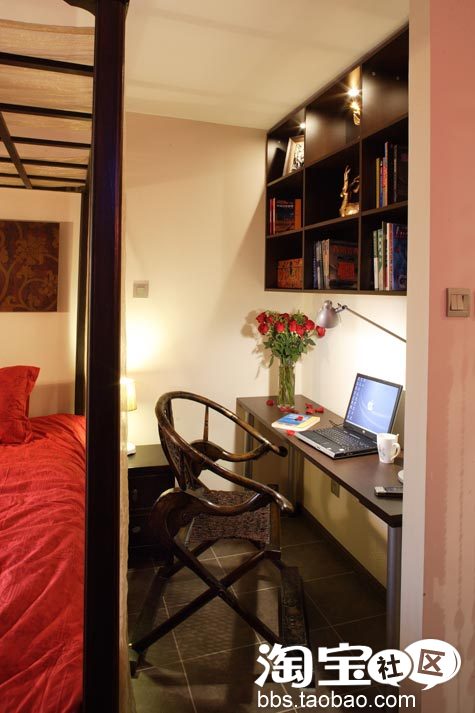 3、 想让小空间即实用又可施展个性,设计师采用了日式塌塌米,可坐可卧的特性弥补了空间的不足,工作累后,可以舒展疲惫的身心,闲暇约一、二知己品茗聊天,未尽兴时亦可留宿彻夜畅谈,塌塌米下超大的储物空间,可尽情收纳,将空间发挥至极致的亦不过如此了!